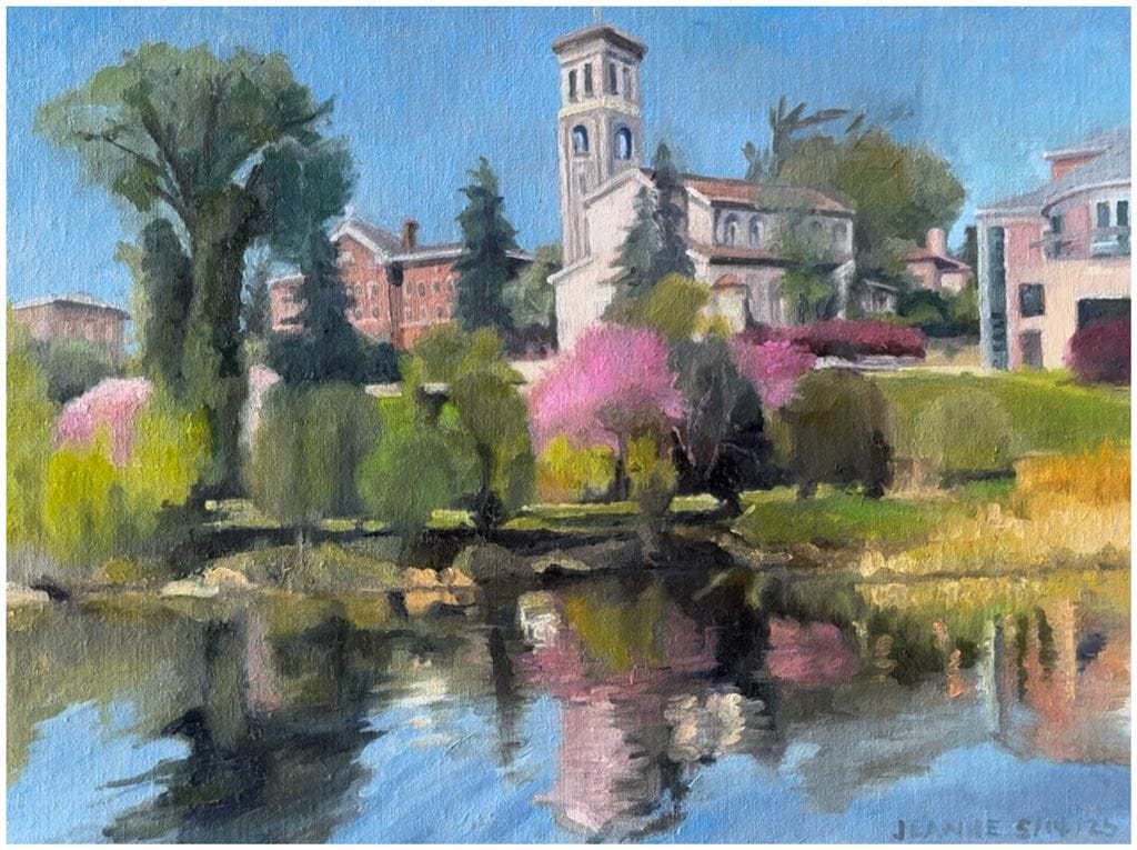 My daughter saw these beautiful pink bushes early in May. She took the video that inspired this painting.